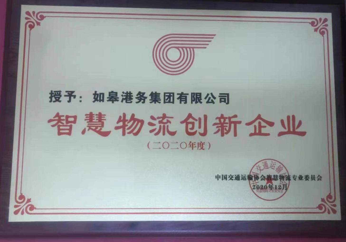 喜報(bào)!如皋港務(wù)集團(tuán)榮獲“2020年度智慧物流創(chuàng)新企業(yè)”稱號(hào)